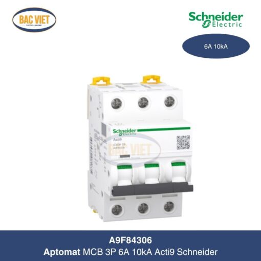 Aptomat MCB 3P 6A 16kA A9F84306 Schneider là một thiết bị đóng cắt tự động thuộc thương hiệu Schneider, dùng để bảo vệ mạch điện khỏi các tình trạng quá tải và ngắn mạch.