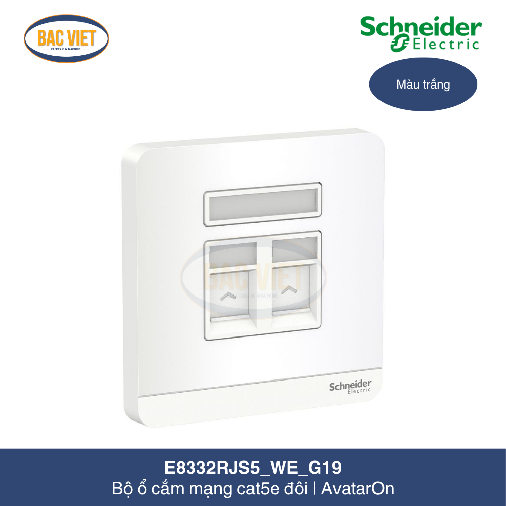 Bộ ổ cắm mạng cat5e đôi màu trắng AvatarOn E8332RJS5_WE_G19 là sản phẩm công tắc ổ cắm thuộc thương hiệu Schneider được lắp đặt với đế nổi hoặc đế âm dạng vuông tạo thành 1 bộ sản phẩm hoàn chỉnh. Trong bài viết này, cùng Cơ Điện Bắc Việt tìm hiểu về bộ ổ cắm mạng cat5e đôi E8332RJS5_WE_G19 Schneider này nhé!