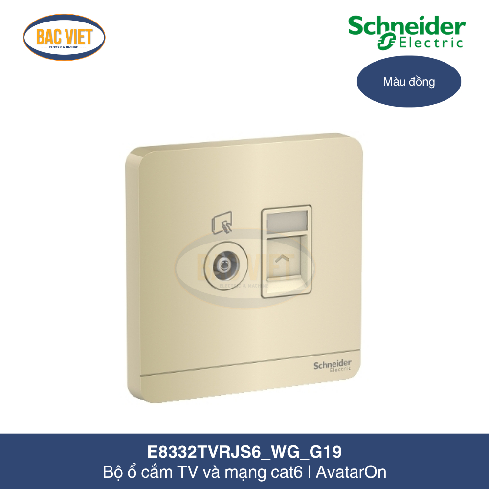Bộ ổ cắm TV và Bộ ổ cắm mạng cat6 màu đồng AvatarOn E8332TVRJS6_WG_G19 là sản phẩm công tắc ổ cắm thuộc thương hiệu Schneider được lắp đặt với đế nổi hoặc đế âm dạng vuông tạo thành 1 bộ sản phẩm hoàn chỉnh. Trong bài viết này, cùng Cơ Điện Bắc Việt tìm hiểu về bộ ổ cắm TV và Bộ ổ cắm mạng cat5e E8332TVRJS6_WG_G19 Schneider này nhé!